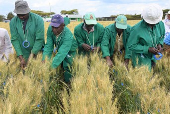 KALRO staff selecting and taping promising wheat plants with resistance to stem rust disease at the wheat stem rust phenotyping facility in Njoro © Joshua Masinde/CIMMYT.
